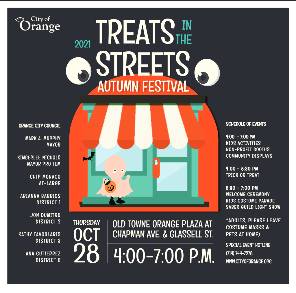 | Treats in the Streets is back! On Thursday, October 28th, the Old Town Orange tradition of “Treats in the Street” will be returning! From 4pm to 7pm the streets are filled with trick or treaters, craft booths and more! Come on down and check it out; we’ll be closing at 5pm, but will be outside passing out candy into the later hours. |