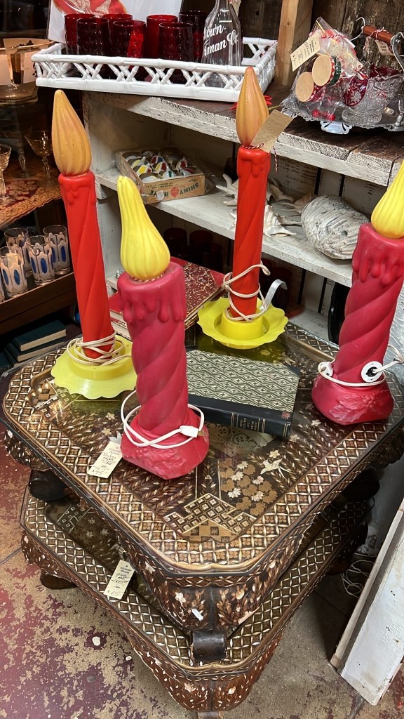 Blow molds are popular again this season, and while we do love a good old Santa or snowman, we are particularly into the vintage candles that have come in recently.