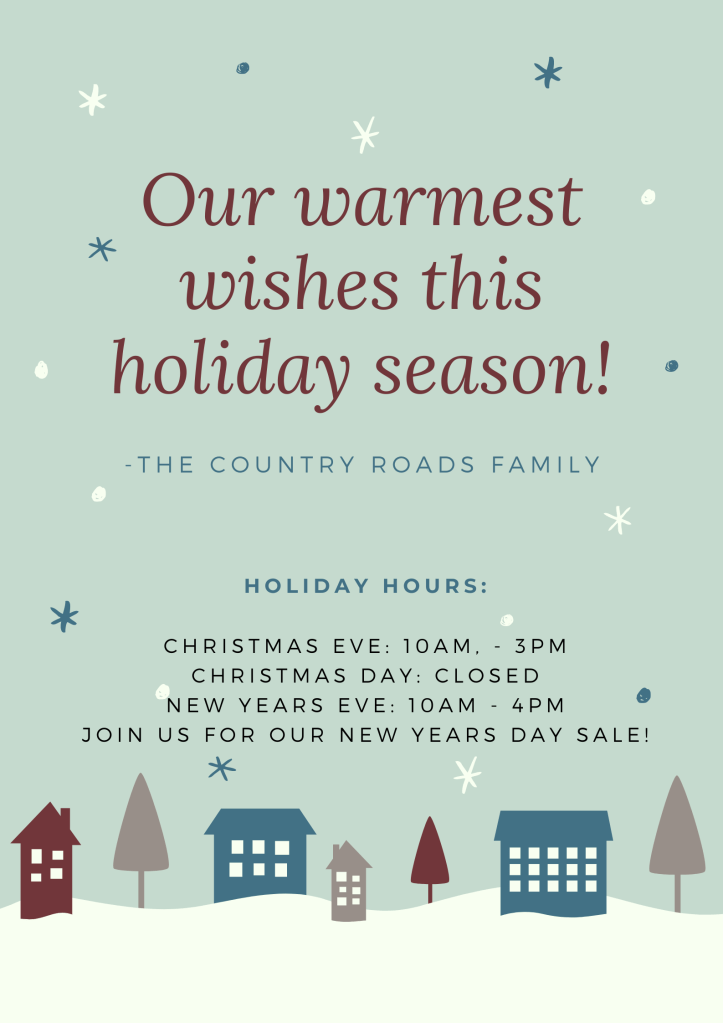 We’ll be closing early on Christmas Eve and on New Year’s Eve, and will be closed on Christmas Day.