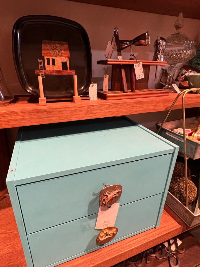 Booth #6 has this a-d-o-r-a-b-l-e turquoise storage box, complete with cool knobs, in stock right now!