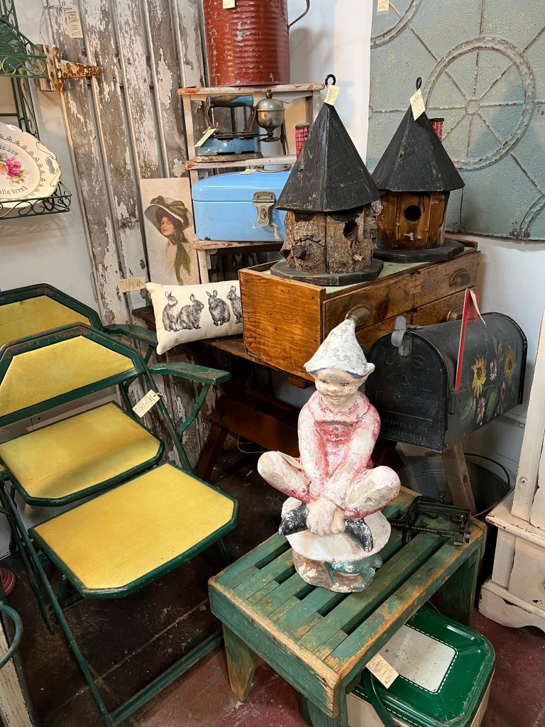 Look at this chairs! There are four total and we are OBSESSED! The color! The shape! Love love love. And the little kinda-creepy-kinda-cute gnome? Adorable.