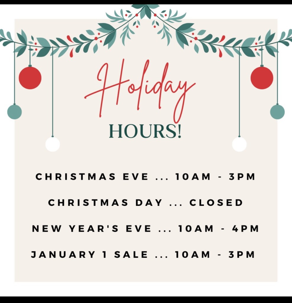 Holiday Hours 2025 Posted byBrande JacksonDecember 21, 2025Posted inUncategorized Share this: Click to share on X (Opens in new window) X Click to share on Facebook (Opens in new window) Facebook Like Loading... Related